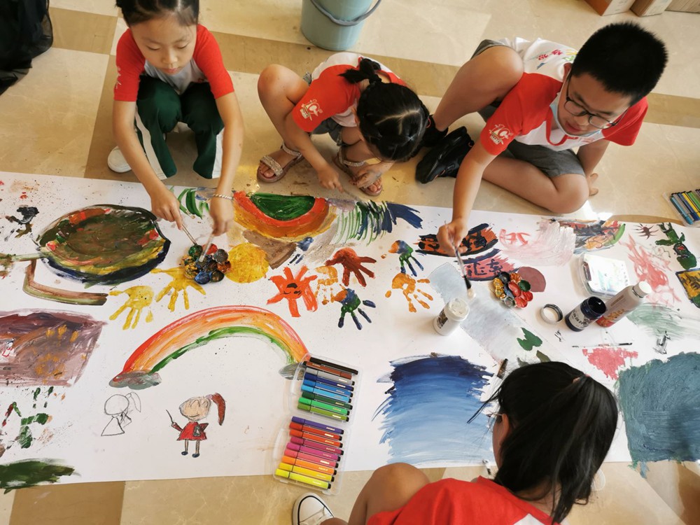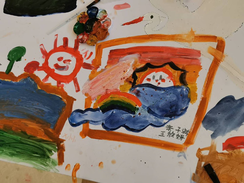 只見(jiàn)他們有的充分發(fā)揮著自己的創(chuàng)造力,化身“小畢加索”,在畫(huà)布上無(wú)拘無(wú)束地釋放自己的藝術(shù)靈感;有的仔細(xì)觀察窗外的晴空和艷陽(yáng),一筆一畫(huà)細(xì)心創(chuàng)作;過(guò)程中,孩子們互幫互助,幫著調(diào)顏料、涂色彩,合力完成這“夢(mèng)的長(zhǎng)卷”。